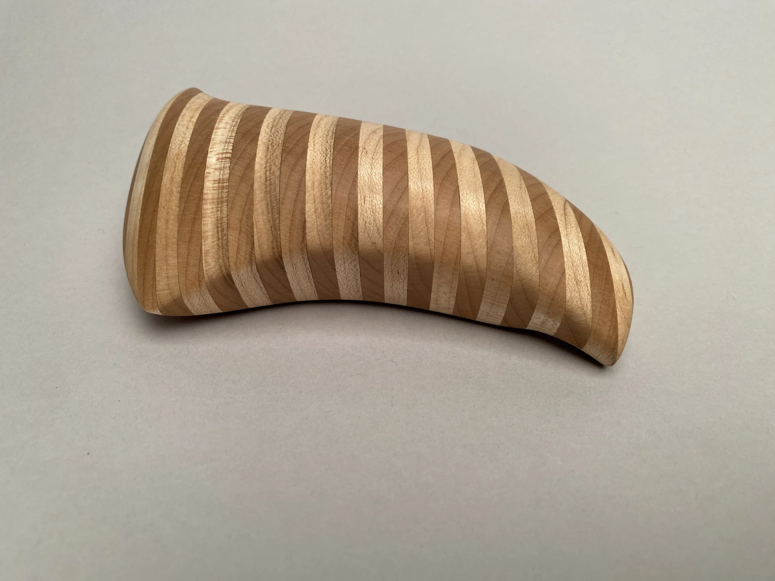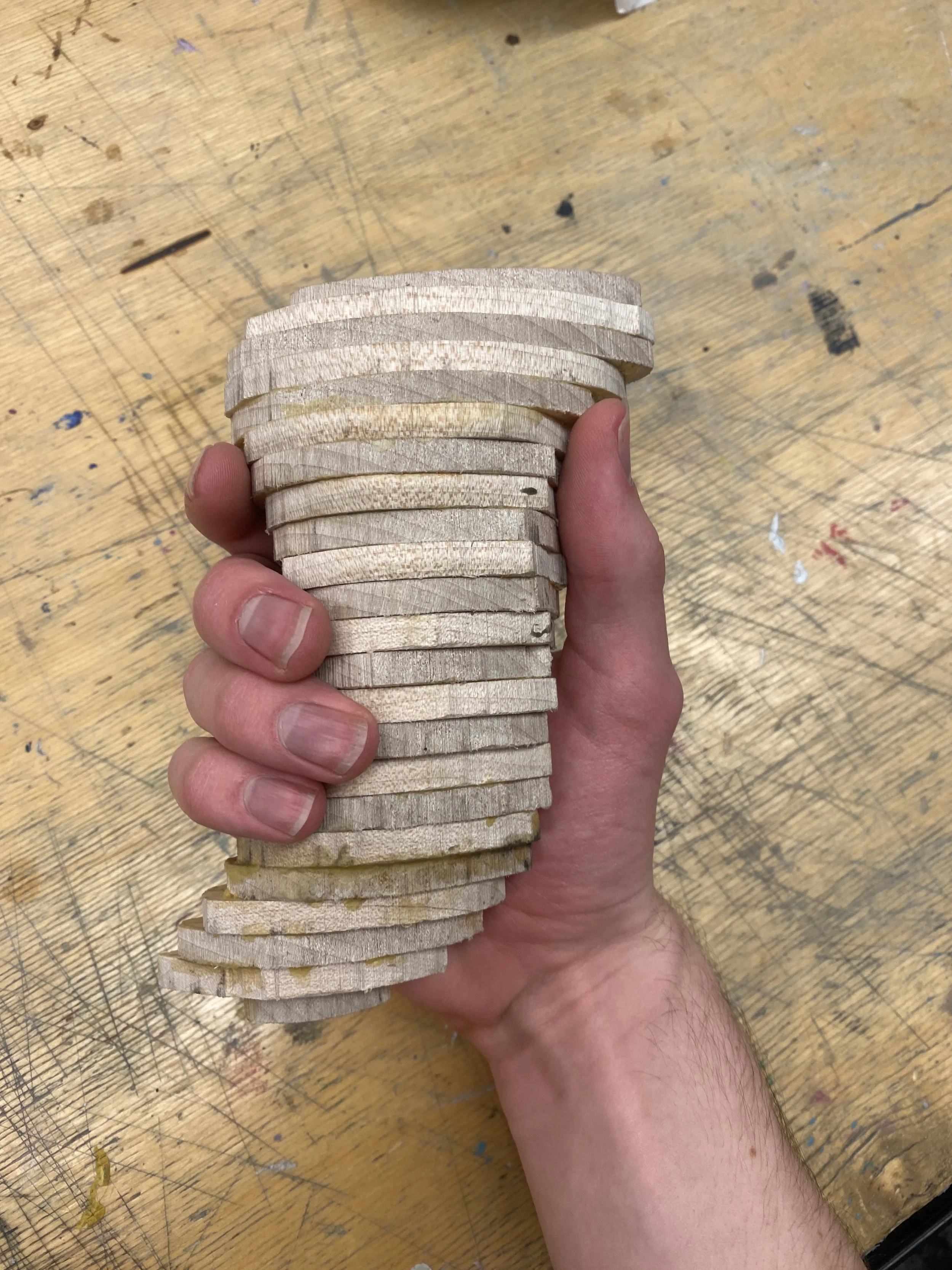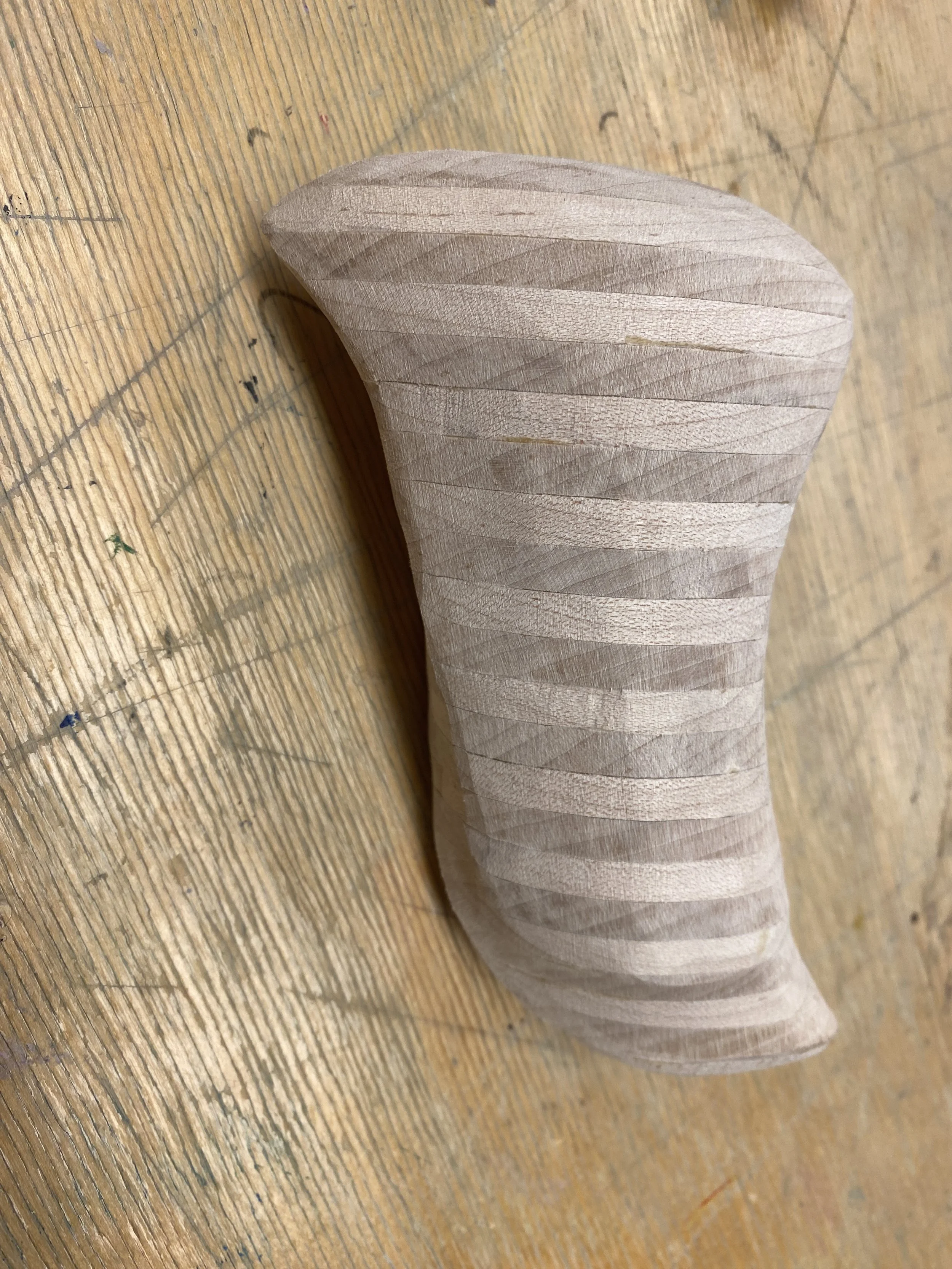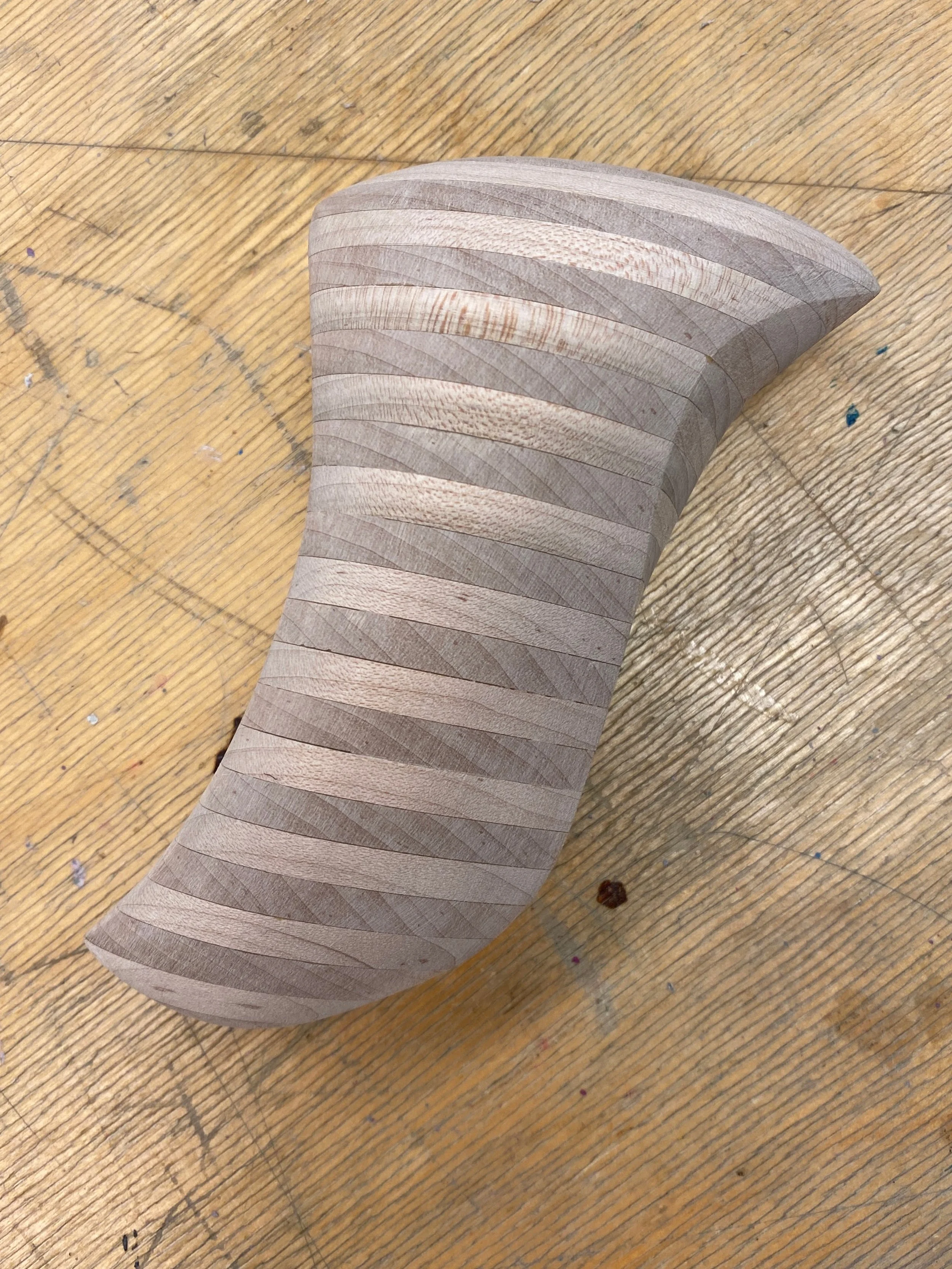 After developing my monolith design I sliced it into quarter inch pieces and traced them on maple wood. After cutting out and glueing the pieces together, I sanded away the edges, working down from a belt sander to sandpaper.