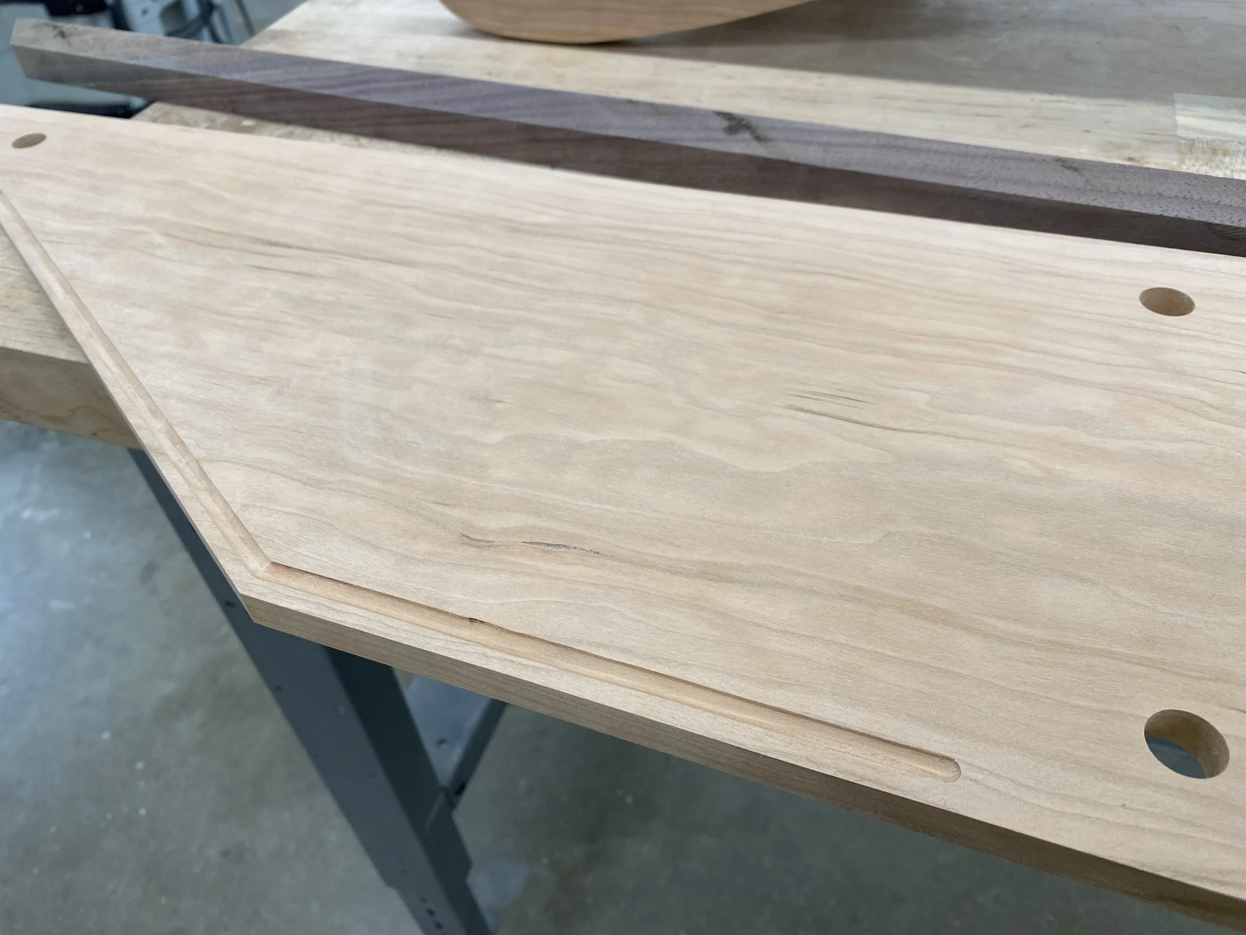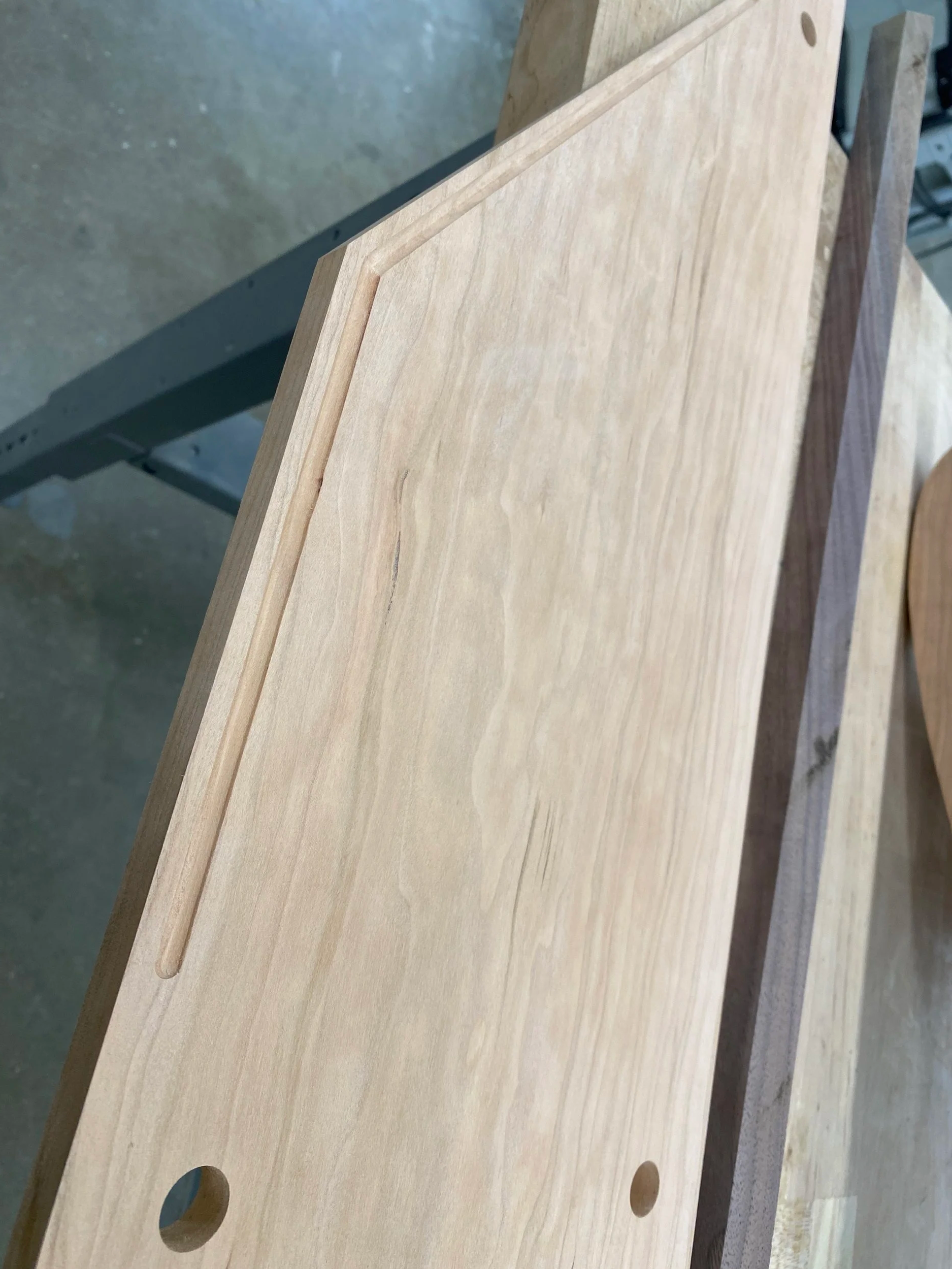I used a router to carve a channel on the front edge to catch objects from rolling off the shelf.